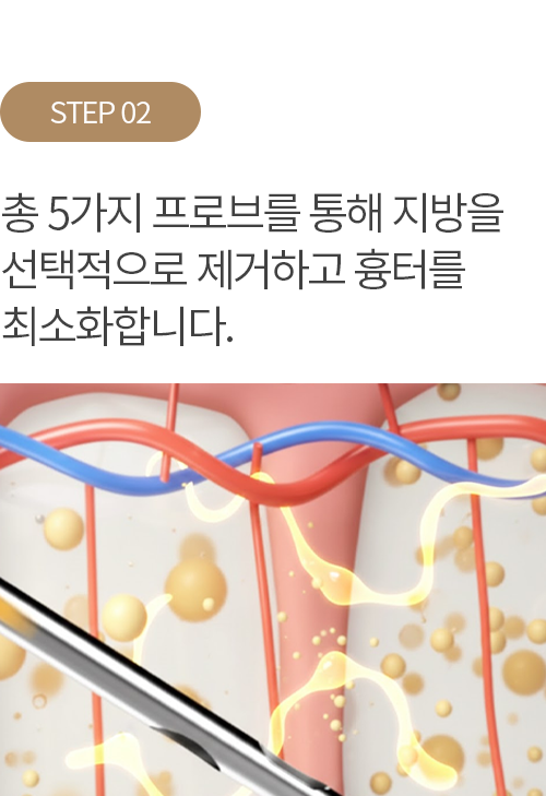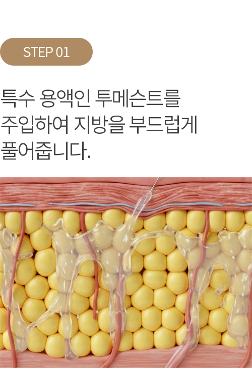 기존 지방흡입과 달리 초음파 에너지를 이용해 지방을 부드럽게 녹인 후 추출합니다. 신경이나 혈관 손상을 최소화하여 시술 후 멍과 부기가 적으며, 지방이 빠진 자리에 타이트닝 효과를 유도해 처짐 없는 탄력적인 라인을 완성합니다.