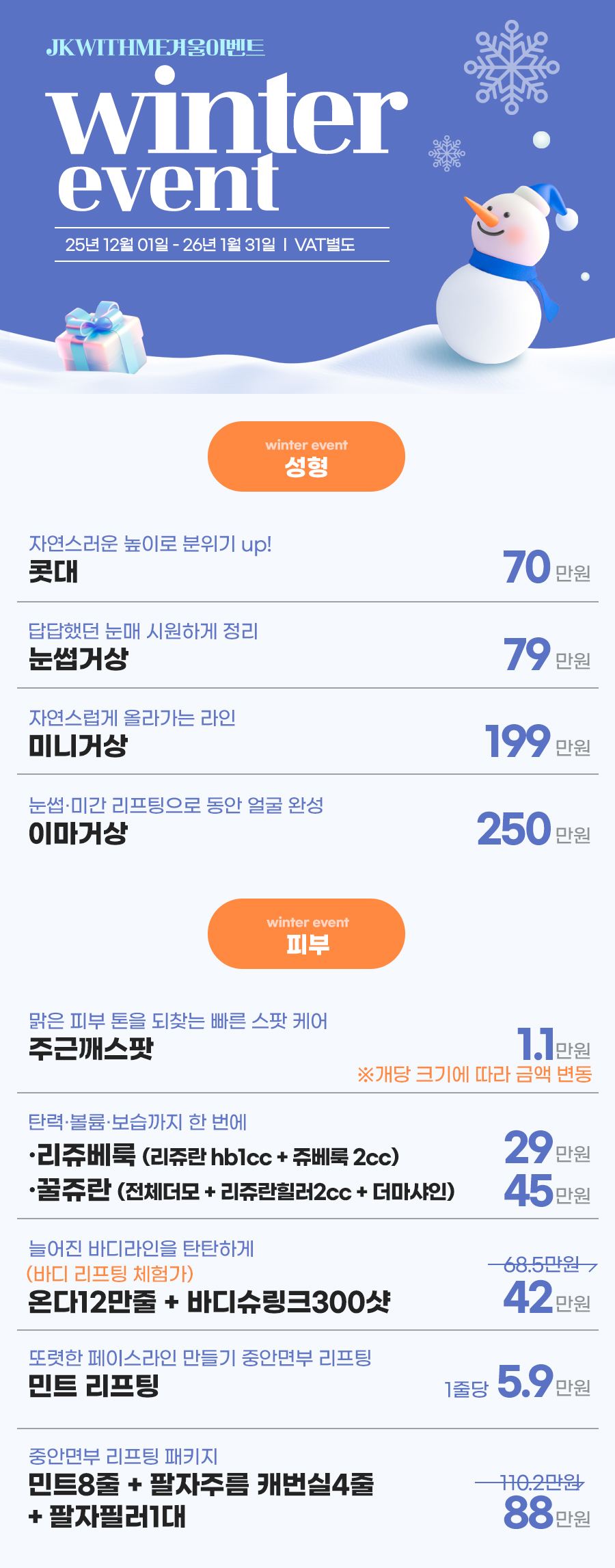 JKWITHME Plastic Surgery · Dermatology 오늘 가장 주목할 JK 위드미 Pick 뷰티 키워드 상담 예약 및 문의하기 JK With Me Plastic Surgery & Dermatology JK With Me CLINIC 공지사항 및 이벤트 전체 이벤트 공지사항 겨울 이벤트 카테고리이벤트 작성일2026-01-13 17:57 조회76 목록으로 실손보험 적용가능 » JK Fit-Log JK 위드미 핏 - 로그 인천눈밑지 재배치 vs 제거, 어떤 차이가 있을까요? 인천이중턱지방흡입 전, 이중턱의 구조적 원인부터 입술필러 빨대 사용 시 주의 사항 송도리쥬란 피부 재생은 어떻게 이루어질까요? 테크노파크역피부과 피부 타입 분석의 모든 것 송도탈모병원에서 살펴보는 탈모 초기와 진행형의 차이 송도코수술 전 알아두면 좋은 남자코성형 기준 보톡스 후 세안 시기와 주의 사항, 꼭 알아두세요 인천 연수구 필러 후 붓기와 멍은 왜 생길까요? 인천 이마거상으로 알아보는 이마 처짐과 인상 변화