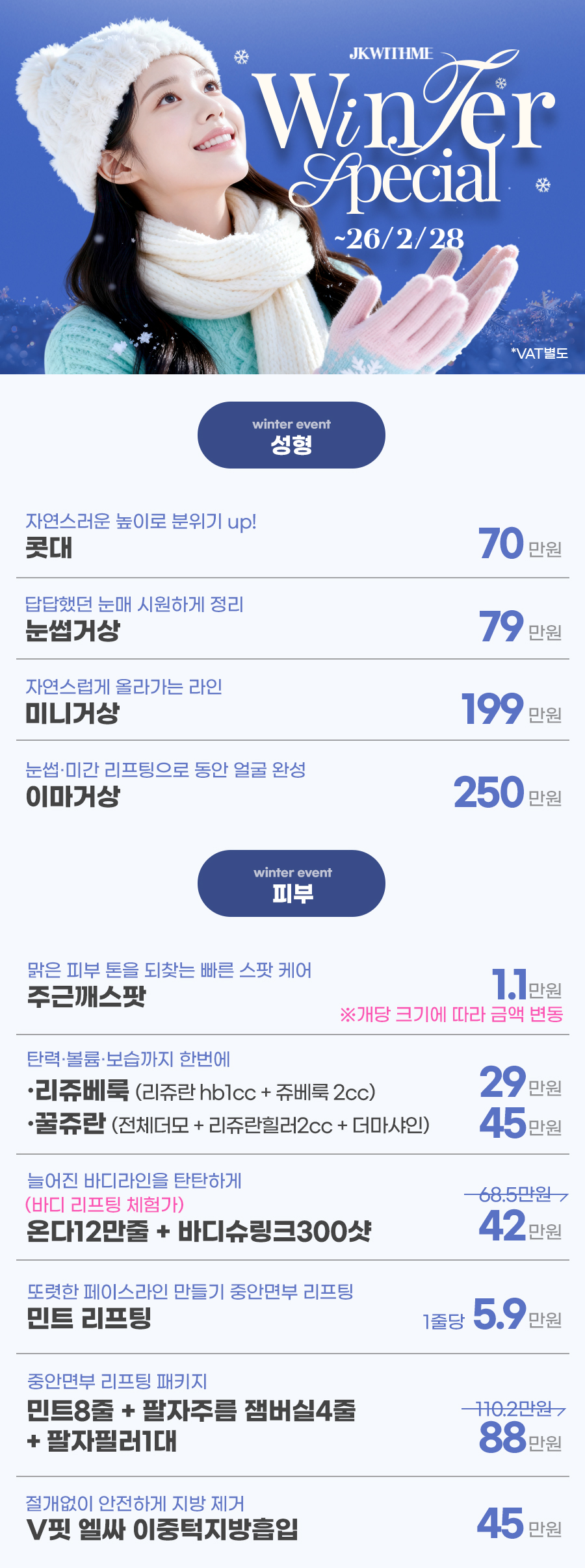 JKWITHME Plastic Surgery · Dermatology 오늘 가장 주목할 JK 위드미 Pick 뷰티 키워드 상담 예약 및 문의하기 JK With Me Plastic Surgery & Dermatology JK With Me CLINIC 공지사항 및 이벤트 전체 이벤트 공지사항 겨울 이벤트 카테고리이벤트 작성일2026-01-15 12:08 조회327 « 베스트 시술 프로그램 목록으로 멘토 가슴성형 이벤트 » JK Fit-Log JK 위드미 핏 - 로그 인천 하안검 vs 상안검 수술, 어떤 차이가 있을까요? 자연스러운 인천 가슴성형을 위한 보형물 선택 가이드 연수구 보톡스 부위별 시술 효과 스킨보톡스 시술 후 바로 운동해도 괜찮을까요? 인천 얼굴 지방흡입, 처진 볼살과 이중턱 개선 방법 송도코수술 전 '이것'까지 고려해야 되는 이유는? 비대칭 눈매 교정을 위한 짝눈 쌍수 수술 방법 알아보기 송도점제거 시술 전 반드시 확인해야 될 모반의 종류는? 피부 탄력 고민, 연수구쥬베룩 시술 전 꼭 확인해야 될 효과와 주의사항은? 인천안검하수 교정, 중년 눈 성형이 필요한 의학적 이유는?