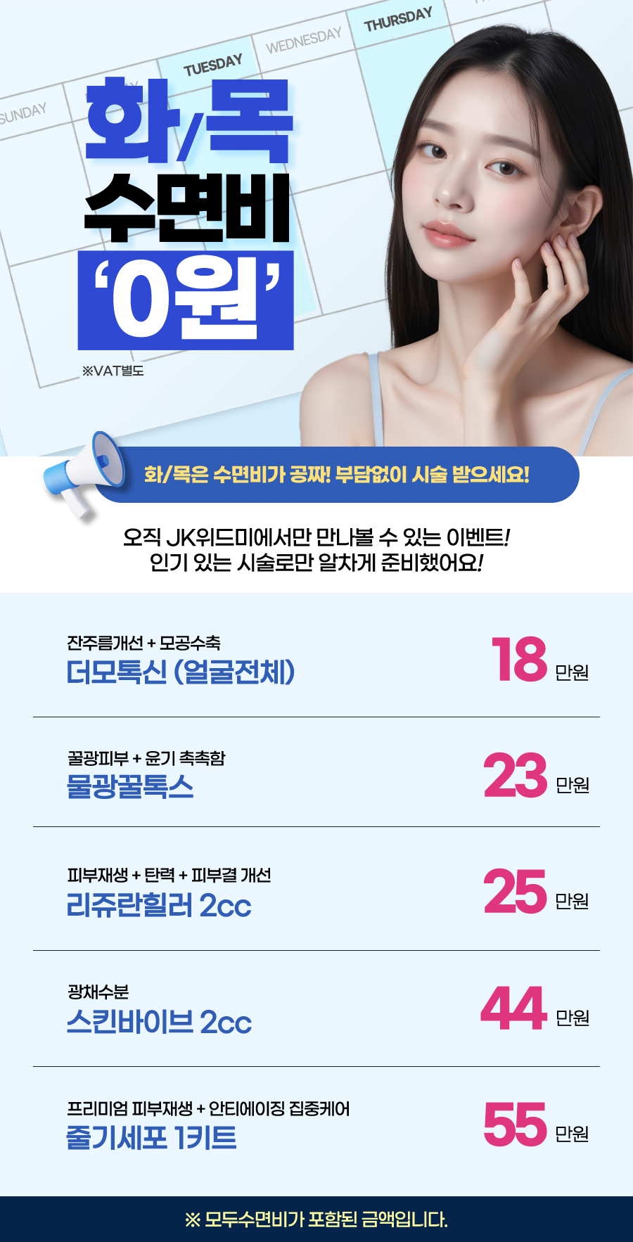 JKWITHME Plastic Surgery · Dermatology 오늘 가장 주목할 JK 위드미 Pick 뷰티 키워드 상담 예약 및 문의하기 JK With Me Plastic Surgery & Dermatology JK With Me CLINIC 공지사항 및 이벤트 전체 이벤트 공지사항 화/목 수면비 무료 이벤트 카테고리이벤트 작성일2026-02-04 10:14 조회130 « 영양주사 목록으로 수면마취 가능 문신제거 » JK Fit-Log JK 위드미 핏 - 로그 인천 하안검 vs 상안검 수술, 어떤 차이가 있을까요? 자연스러운 인천 가슴성형을 위한 보형물 선택 가이드 연수구 보톡스 부위별 시술 효과 스킨보톡스 시술 후 바로 운동해도 괜찮을까요? 인천 얼굴 지방흡입, 처진 볼살과 이중턱 개선 방법 송도코수술 전 '이것'까지 고려해야 되는 이유는? 비대칭 눈매 교정을 위한 짝눈 쌍수 수술 방법 알아보기 송도점제거 시술 전 반드시 확인해야 될 모반의 종류는? 피부 탄력 고민, 연수구쥬베룩 시술 전 꼭 확인해야 될 효과와 주의사항은? 인천안검하수 교정, 중년 눈 성형이 필요한 의학적 이유는?